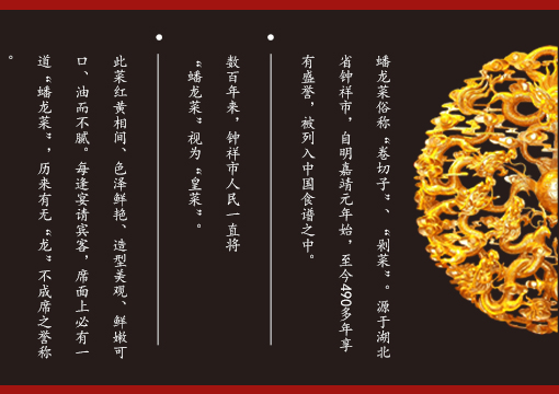 湖北鐘祥市人民一直將蟠龍菜視為“皇菜”。此菜紅黃相間、色澤鮮艷、造型美觀(guān)、鮮嫩可口、油而不膩。每逢宴 請(qǐng)賓客,席面上必有一道“蟠龍”菜,歷來(lái)有無(wú)“龍”不成席之譽(yù)稱(chēng)。